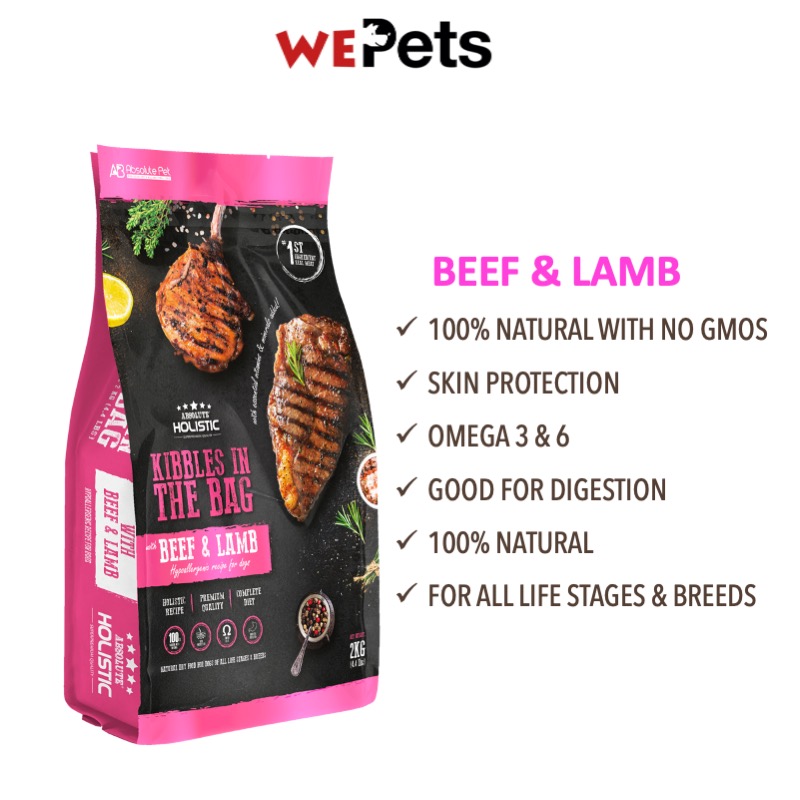 Kibbles in the bag - Beef & Lamb:Crafted to meet the unique needs of your pets, this recipe provides dogs of all life stages with a high digestibility diet to reduce intestinal issues. Containing only the finest ingredients including fresh hypoallergenic meat with low cholesterol content, each meal supplies high biological value derived from premium cuts of red meat and wholesome grains. enriched with FOS (fructooligosaccharides), Yucca Schidigera and essential fatty acids including omega-3 and omega-6, let your pet thrive with a strong gut health while boosting their immune system and maintaining healthy skin and coat.