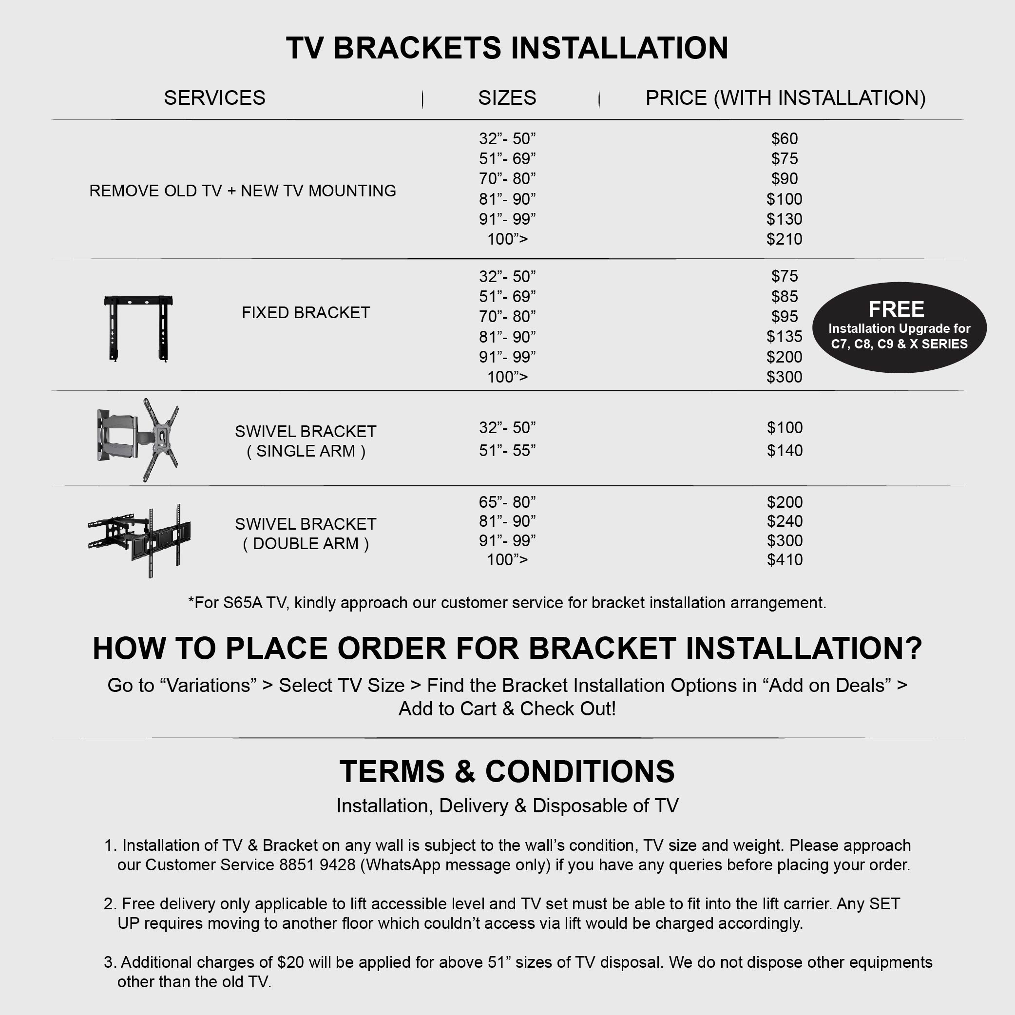 ? To install TCL Single/ Double Arm Swivel Bracket for mounting of TCL TV.