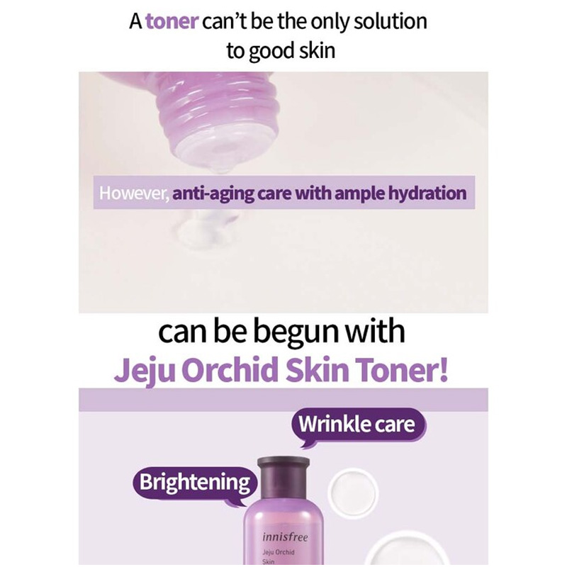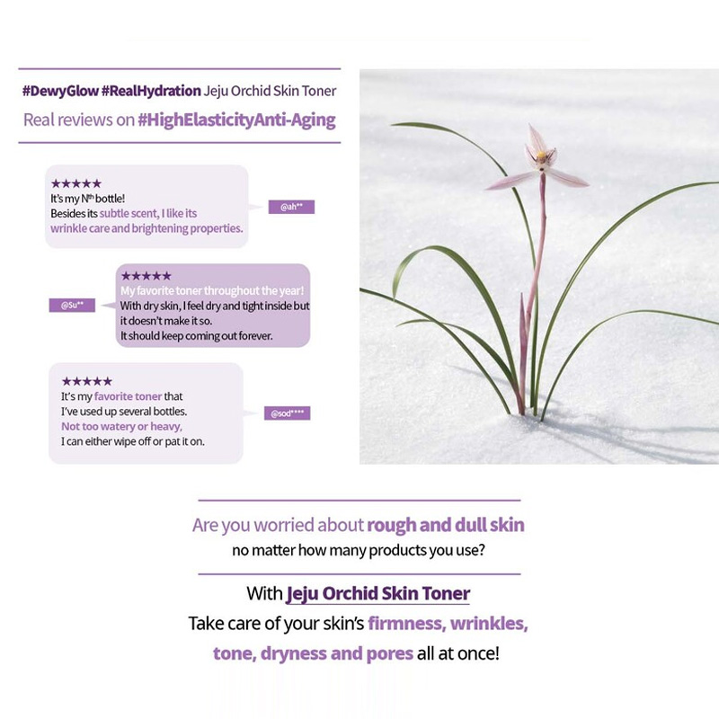 Volume / Weight 200ml / 232gIdeal for for all skin typeExpiration Date 36 monthsHow to Use Apply over face and neck after cleansing, then gently pat for better absorption.Manufacturer / Distributor Cosvision Co., Ltd. / innisfree CorporationCountry of Manufacture South KoreaIngredients WATER / AQUA / EAU, BUTYLENE GLYCOL, GLYCERIN, ALCOHOL, NIACINAMIDE, GLYCERETH-26, GLYCERYL POLYMETHACRYLATE, DIMETHICONE, PPG-13-DECYLTETRADECETH-24, PROPANEDIOL, AMMONIUM ACRYLOYLDIMETHYLTAURATE/VP COPOLYMER, GLYCERYL CAPRYLATE, ACRYLATES/C10-30 ALKYL ACRYLATE CROSSPOLYMER, HYDROGENATED LECITHIN, FRAGRANCE / PARFUM, ETHYLHEXYLGLYCERIN, ADENOSINE, POTASSIUM HYDROXIDE, DISODIUM EDTA, HYALURONIC ACID, SODIUM METHYL STEAROYL TAURATE, BETAINE, GLUCOSE, ORCHID EXTRACT, ACETIC ACID, TOCOPHEROL MFDS Evaluation of Functional Cosmetics YCautions for Use (1) For external use only. (2) Avoid direct contact with eyes. (3) If contact occurs rinse thoroughly with water. (4) Discontinue use and consult a doctor if irritation occurs. (5) Keep out of reach of children. Quality Assurance Standard Compensation for defective products is provided according to the criteria notified by the Fair Trade Commission. |