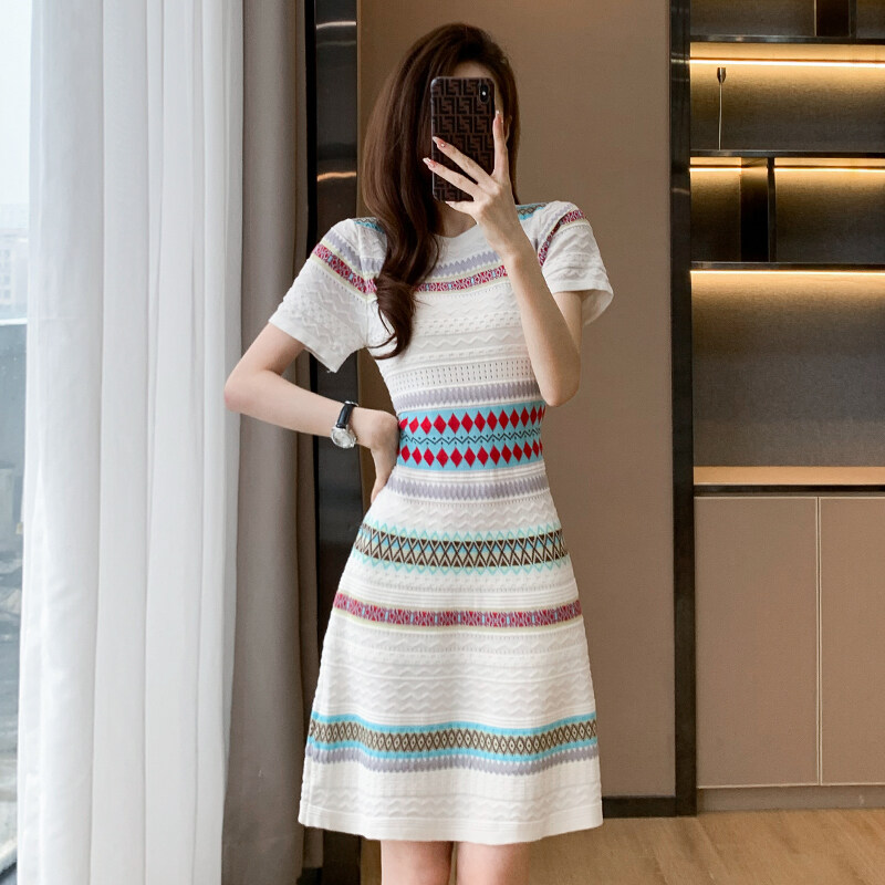 Missliu Fashion Women's Light Luxury Small Fragrance Dress Summer New High-End Elegant Striped Ice Silk Knitted Short Sleeve Skirt