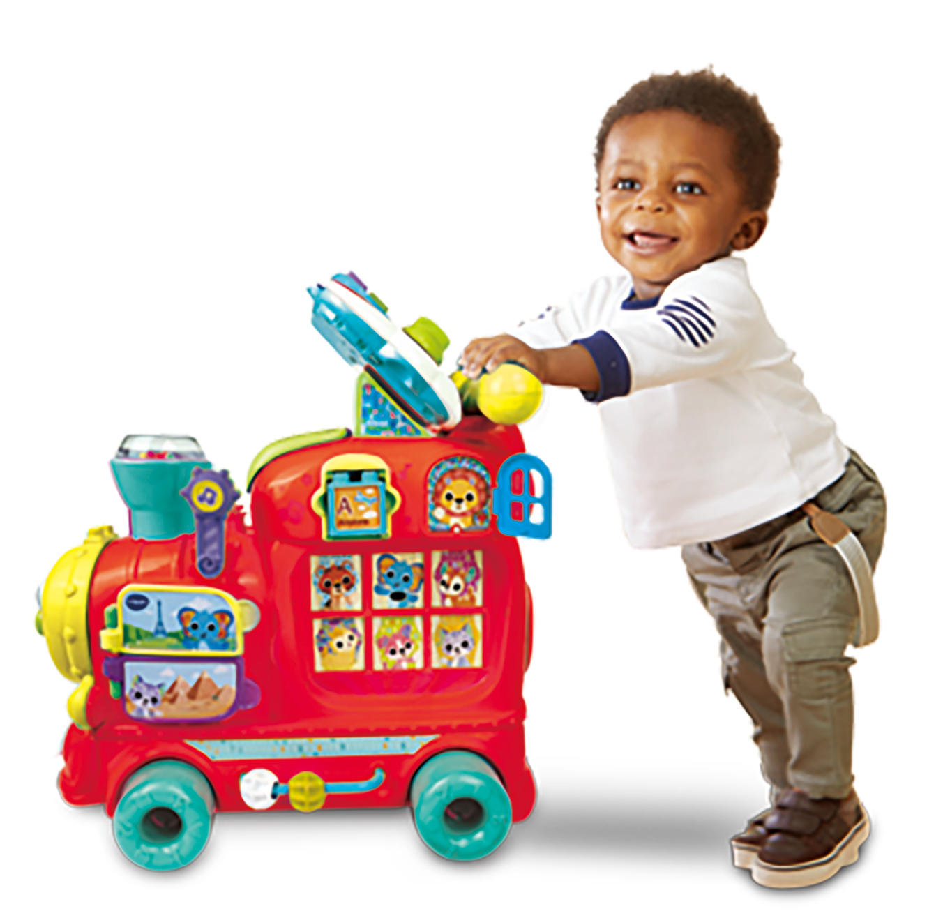 4-in-1 grow with me alphabet train includes modes for sit-down play, walker, pull-along wagon and ride on. Teaches objects, animals, phonics, colours, numbers and much more.