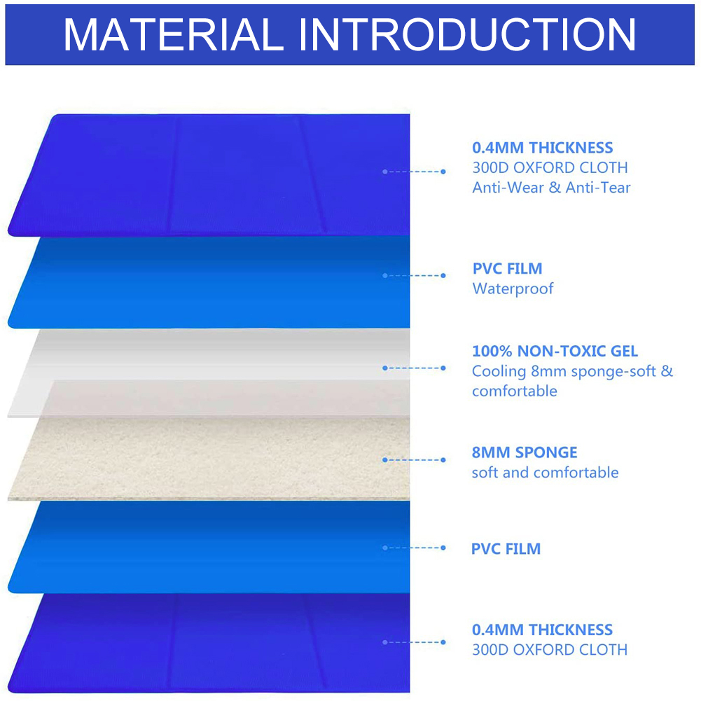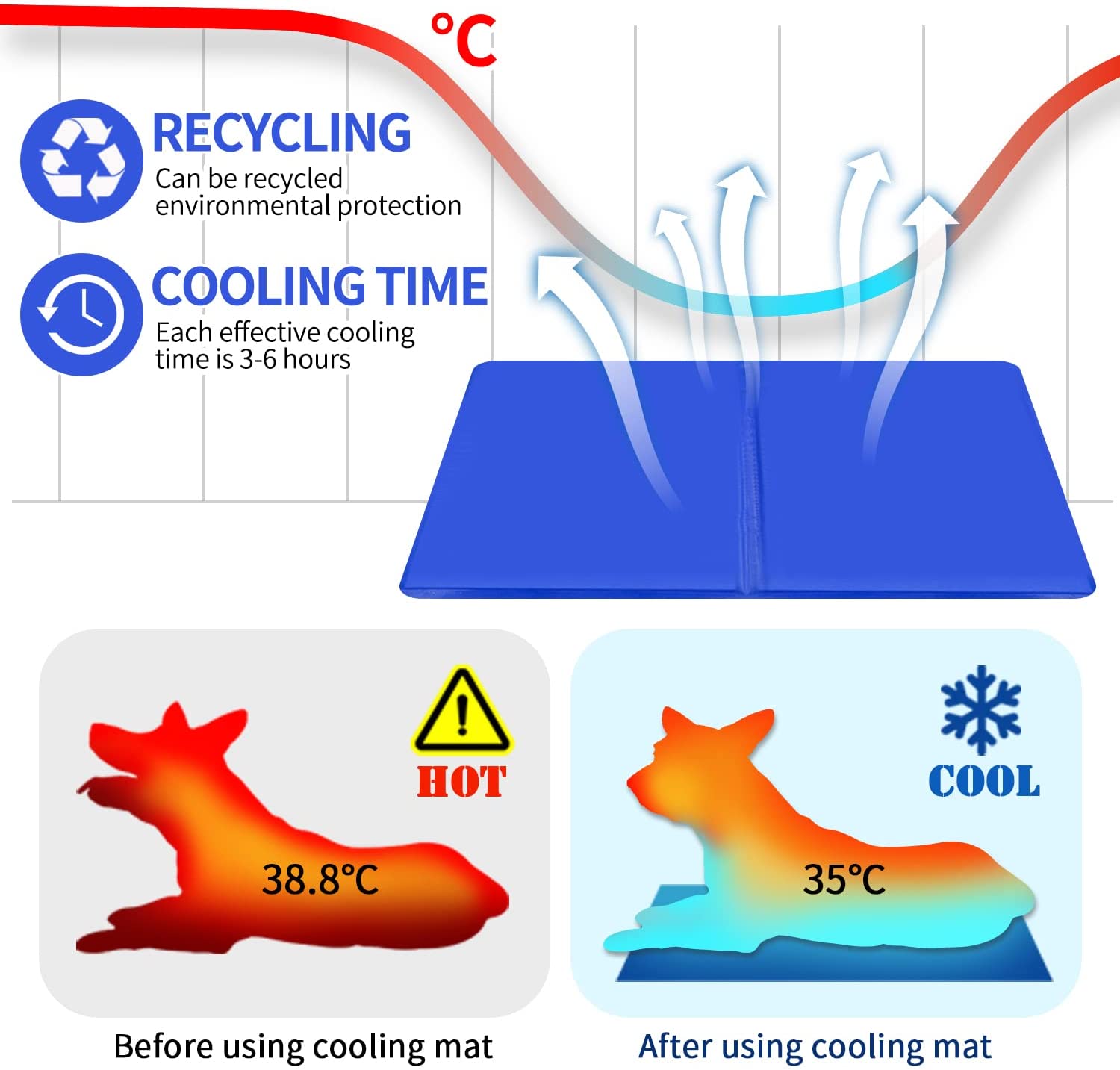 Pet cooling mat cools your dog as soon as they lay on it. The pressure-activated, non-toxic, cooling gel formula is activated by your pets weight/heat and lasts for up to at least 3 hours.