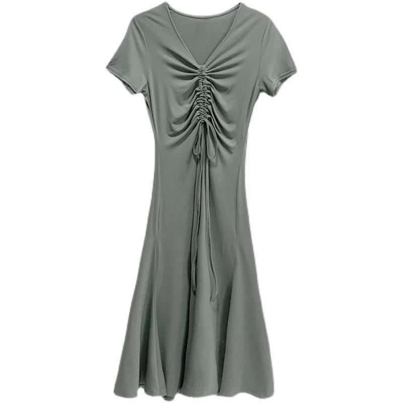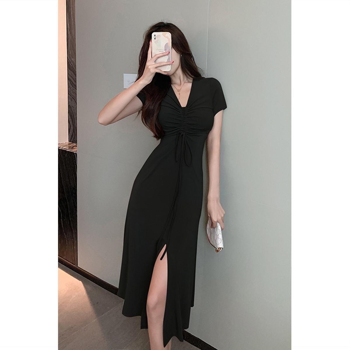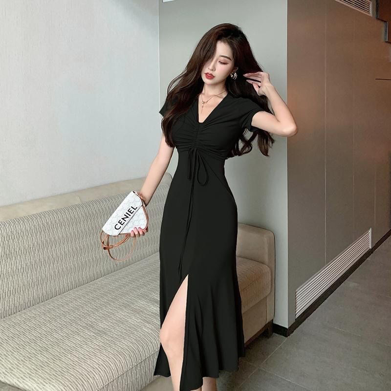 Dresss Korean Style Fashion Black V-neck Drawstring Short Sleeve Split Dress French Temperament Long Skirt