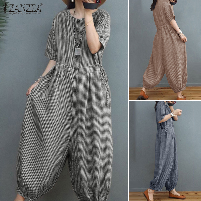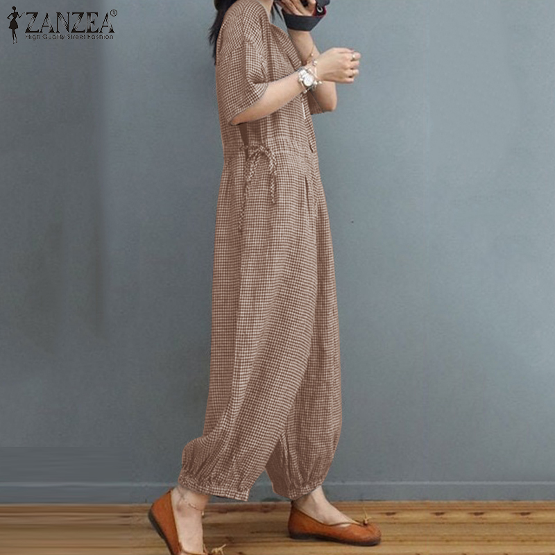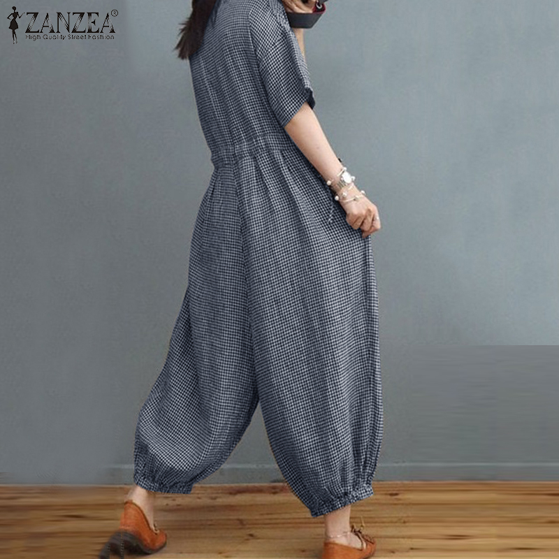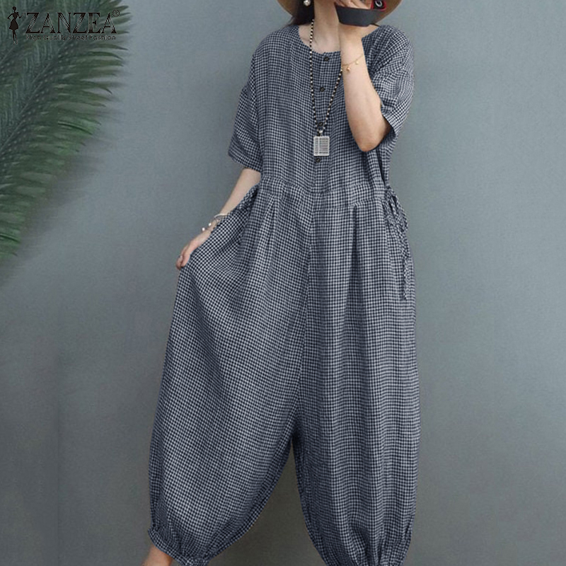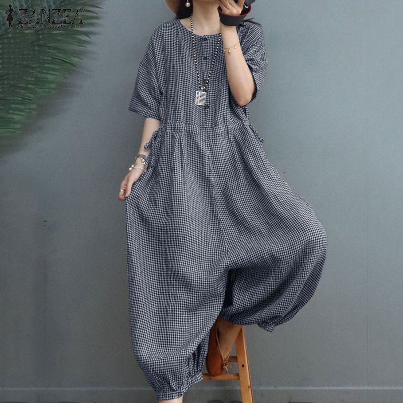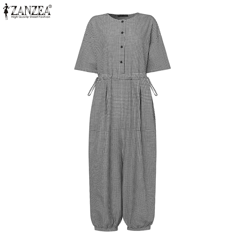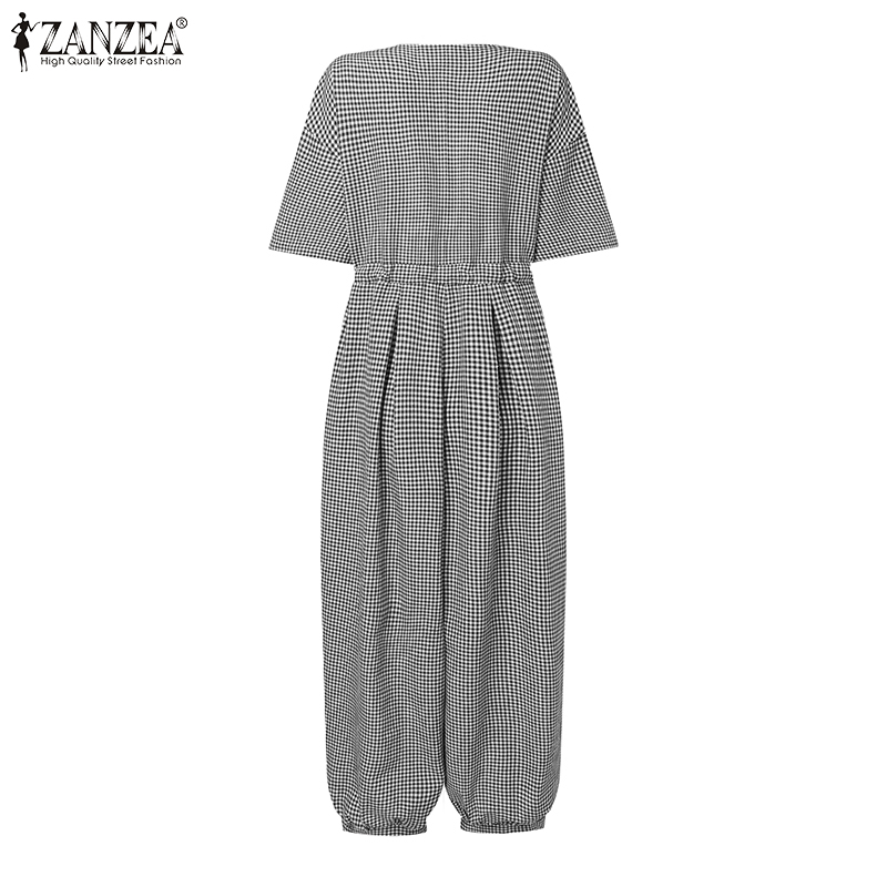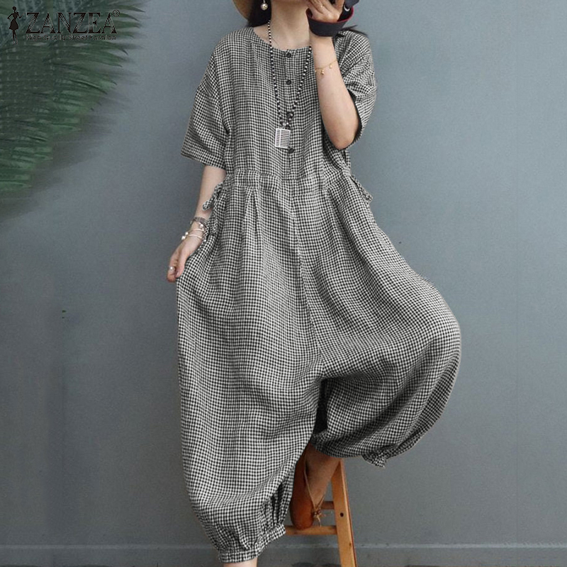 ZANZEA Women's Overalls Grid Printed O-Neck Short Sleeve Playsuits Vintage Loose Harem Pant Jumpsuits #15
