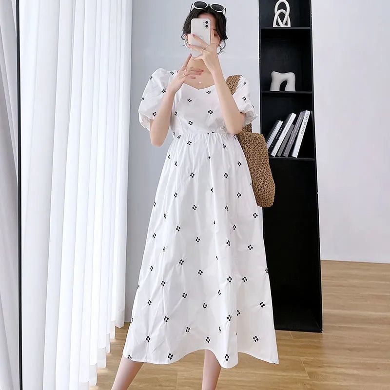 Maternity Dress Korean Style Plus Size Summer High Waist Slimming Cover Belly Pregnant Women Dress Fashion Loose Flower Pregnant Dress Casual Mid-length Short-sleeved Maternity Dress Pregnant