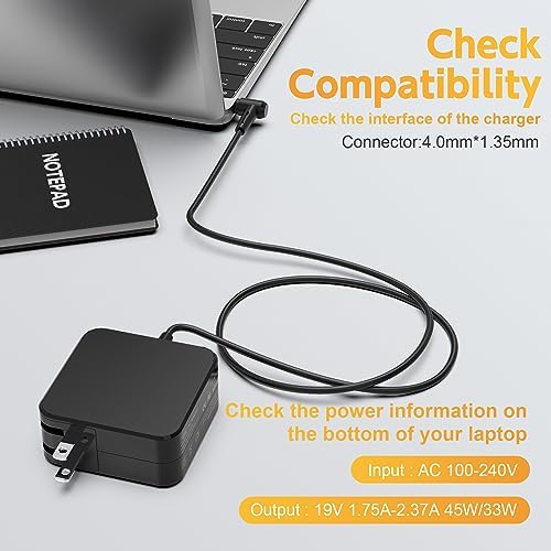 ? Output: 19V, 2.37A, 45W (Also Compatible with 33W, 19V, 1.75A); Input: 100-240V ; Connector: 4.0*1.35 mm. (Please check before purchase) ? Laptop Charger for Asus Vivobook 14 15 17: F412D, F412DA, F412DA-NH77, F412DA-WS33, F510U, F510UA, F510QA, F510Q, F510, F512JA, F512J, F512DA, F512D, F512FA, F512F, F512, E403S, E403S, E403NA, E403N, E410MA, E410M, E410, E510MA, E510M, E510; Asus Chromebook C202, C202S, C200MA, C202SA, C300, C300M, C300MA, C300S, C300SA, C202SA-YS02, C202SA-YS01 etc. ? AC Adapter for Asus Q Series: Q200, Q200E, Q302, Q302L, Q302LA, Q302U, Q302UA, Q303, Q303U, Q303UA, Q304, Q304U, Q304UA, Q324, Q324U, Q405U, Q405, Q503, Q503U, Q503UA, Q504, Q504U, Q504UA, Q505, Q505U, Q525, Q525U, Q553, Q553U, Q553UB. ? 45W Laptop Charger for Asus ZenBook: UX305F, UX360C, UX305FA, UX303U, UX305L, UX31A, UX330U, UX330UA, UX333FA, UX430U, UX430UA, UX433F, X512, X512D, X512DA, X512J, X515, X515J, X515JA, X540, X540L, X540LA, X540S, X540SA, X541, X541S, X541SA, X541U, X541UA, X202E, X451C, X541NA, X553MA, X712, X712F, X712J, D553M, F553, F553M, F553MA, F556, F556U, L402S, L402WA. ? Compatible with Asus T Series: TP201SA, TP201, TP201S, TP203, TP203N, TP203NA, TP300, TP300L, TP300LA, TP301UA, TP301U, TP301, TP401, TP401C, TP401CA, TP401N, TP410UR, TP410UA, TP410U, TP410, TP412UA, TP501U, TP501, TP510UA, TP510U, TP510, T304UA, T304U, T304, TX201, TX201L, TX201LA. (For more models, please refer to the description below) ? What You Get: 1 x AC Adapter (7.5Ft Cable), 365 Days Warranty Guaranteed by the Manufacturer and 24-hour friendly customer service. If you have any questions, please contact us.