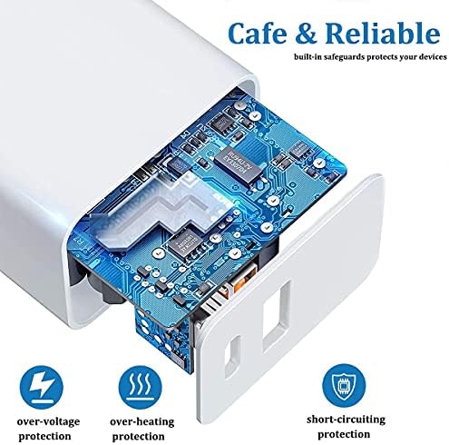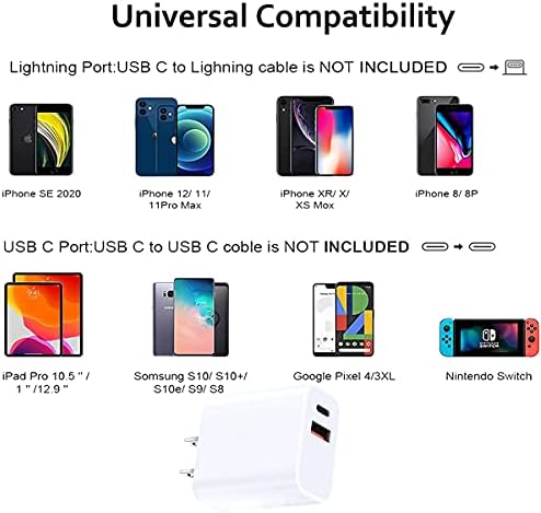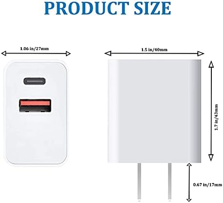 【Compact and Tiny】 USB and Type C 2 port charger, extremely compact style, seamless injection molding process, easy to carry and save certain space of your handbag or wall socket; Maximum portability for you whether you are in a home, office or vacation; The item weights only 29g, size is about 1.54in L x 1.06in W x 1.77in H. 【Ultra Compatibility】2 in 1 charger USBA and Type-C Compatible with Apple2.4,PD3.0, QC3.0/2.0,DCP,AFC,FCP, BC1.2 and other fast charging protocols.International universal 100-240V 50/60Hz voltage input, suitable for most countries and regions; It can be used with PD and QC compatible devices, including iPhone 13/13 Mini/13 Pro/13 Pro Max/11/11 Pro / 11 Pro Max/SE,AirPods Pro,Switch, 11”/12.9”iPad Pro,iPad Air (third generation), iPad Mini (fifth generation), AirPods Pro,Samsung/LG/Google etc. 【20W Total Output 4 Times Faster】 Input: 100-240v~50-60Hz 0.5A,output: 5V=3A 9V=2.22A 12V=1.67A. Total output: 20W MAX, it also smartly adjust the input power of the phone in order to prevent cell phone from overcharging and overheating, thereby maximizing battery life; Compared with original 5W charger, iPhone 12 and previous iPhone models recharging speed reaches 4 times faster. 【Automatic Temperature Control】 Charging base applies for advanced technology to improve conversion efficiency and effectively reduce heating of the charger. When temperature of the control chip is exceeds 80℃ or the NTC temperature exceeds 60℃,charging adapter will automatically stop working. The built-in protection device also protects your equipment from excessive current, overheating and overcharging. 【Multiple Protections】 The charger is made with fire-retardant and flame-retardant PC plastic which is capable of preventing autoignition when temperature is too high. At the same time, it is equipped with protection function such as overcurrent, overvoltage, short circuit, overcharge and anti-surge. Guarantee safety issues smartly during the safe use of charging.