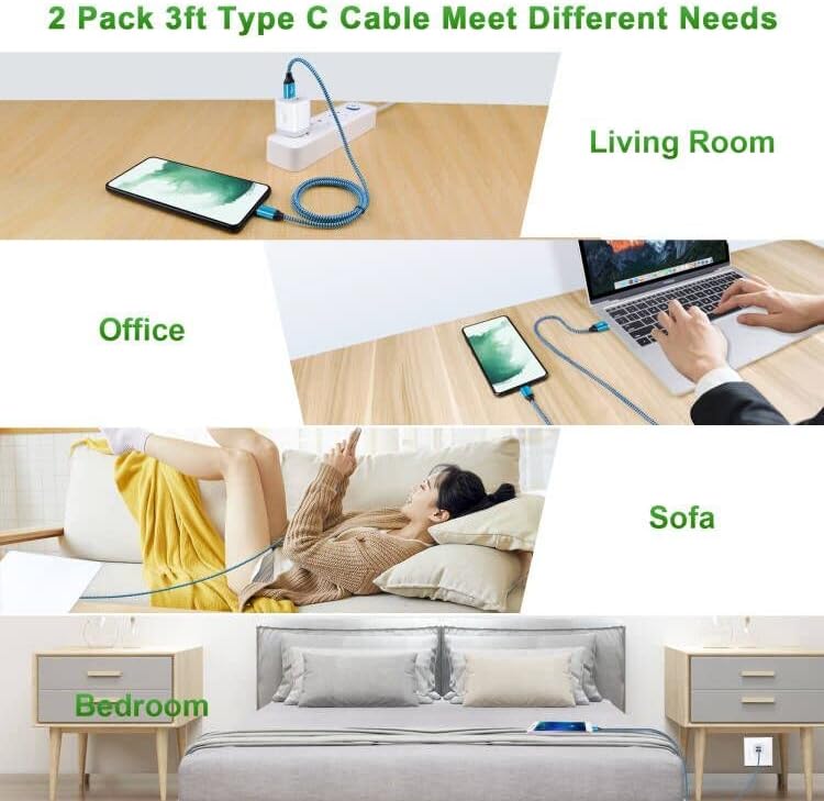 【Broad Compatibility】USB Type C Cable Fast Charging for Samsung Galaxy A15 5G,A14,A13,A54,S23 Ultra,S23+,A03s,A53,A23,A25,A24,S22,S21 FE/Ultra,S20 FE,S10e,S9,Z Fold 5 4 3,Z Flip 5 4,A12,A32,A52,A02s,A42,A52,A10e,A73,M52,M42,M32,Note20 Ultra/10/9;iPhone 15/15 Pro Max/15 Plus;Google Pixel 8,8 Pro,7a,7,7 Pro,6,6a,5,4a XL,4,3 XL,2;Moto Edge 5G UW,Edge Plus,Edge 20 Lite/20Pro,G100,G30,G10,G Play/Power/Stylus(2022),Z/Z2 Force/Z3/Z4;OnePlus Nord N200/N10/CE/10Pro/9/8T/7/6/5T and other type c device. 【3A Fast Charge & Sync】Android Charger Cable supports safe high-speed charging at 3A and data transfer speed up to 480Mb/s, 30% faster compared with other cables. Data Transfer and Power Charging 2 in 1. 56kO resistor provide outstandingly reliable conductivity & stability, protect your devices and charging adapters from damage. To achieve fast charging, you will need a usb wall charger rated for fast charging and a phone capable of the same. 【USB A to C Type C Charger Cord Enhanced Durability】Special Strain Relief Support design can bear 12000+ bending test, protect the most vulnerable joint of galaxy s22 charger type c usb cable. Premium aluminum housing and sturdy nylon fiber cover adds premium durability to the cable. Cables are tangle free & durable enough to withstand everyday heavy usage, but still in great performance. 【Special Design of USB C Cord】Nylon braided technology reinforces cord's durability, not easy to break and crack. 3ft USB C charging cable provides an extension for use, perfect for travel, home and office. Perfect 3ft long cord is enough for you to use without being restricted by the power socket location. The samsung c type charging cable support from both sides, can be inserted "positive and negative insert" function. 【What You Get 】3-Pack 3ft Nylon Braided USB 2.0 Type C Fast Charging Cable(White,Blue,Purple). 12-month worry-free warranty. If you have any concerns about our samsung android cell phone c charger cable, please feel free to contact us by email, we promise to help you resolve the issues ASAP.