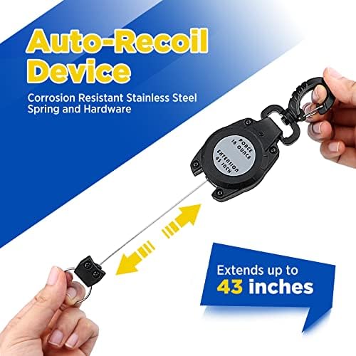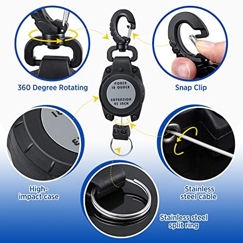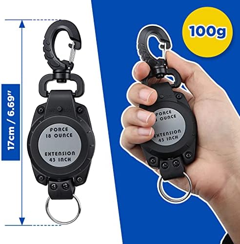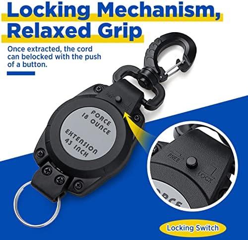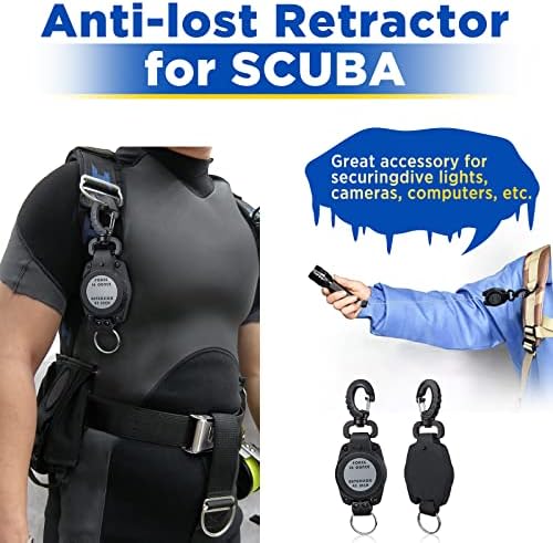 GEAR RETRACTOR - Provides a split ring on one end, and a snap clip on the other, with retracting cable in between, allowing you to relax your grip when extended for long periods. Great for underwater sports. STAINLESS STEEL CORD - Unique stretchable concealed stainless steel wire inside for easy access, strong and corrosion resistant, extends up to 43" (109.2 cm) and has 18 ounces of retraction force. LOCKING FUNCTION - our retractor has a new locking mechanism for a relaxed grip, just simply push a button, and divers can lock or free the retractor anytime. It is really convenient for photography. SECURE TOOL - The plastic snap clip allows for quick and easy access to equipment secured to BCD or weight belt. And the key ring for attaching a light, camera, exposure meter, octopus, compass, or more. WIDELY APPLICATION - Lightweight and shatter-resistant Black polycarbonate case, durable and portable. Great gear accessory for scuba diving, snorkeling, freediving, spearfishing, swimming, and more.