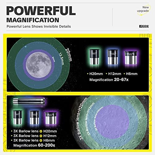 Premium Optical System: Our telescope features high-quality lenses, a 70mm aperture lenses, and 400mm focal length, providing bright, clear, and high-contrast images with advanced full-coating technology and scratch-resistant coatings.. User-Friendly Design: Easy to assemble and operate, designed for astronomy beginners and children, making it ideal for education and family entertainment with a quick start guide provided. Comprehensive Observation Accessories: Includes K25mm and K10mm eyepieces, a 3X Barlow lens, and a 5x24 finder scope, enhancing observation flexibility and effectiveness for various astronomical activities. Stable and Adjustable Tripod: Equipped with an aluminum alloy tripod that adjusts in height and angle, providing a stable observation base adaptable to different locations. Portable Design: Lightweight with a dedicated carrying bag for easy transportation and storage, suitable for family education, outdoor activities, and hiking. Comes with a phone adapter for capturing and sharing images, along with a wireless remote and finder scope for convenient celestial object location.