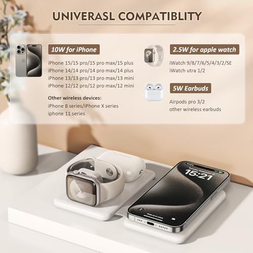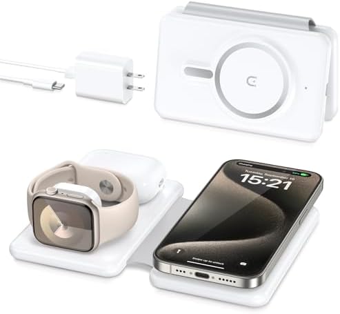 【3-in-1 Foldable Charger Station】If you're an Apple aficionado with an Apple Watch, iPhone, or AirPods, this apple charging station is an absolute must-have. It's like having a magical portal to charge all your essential devices in one fell swoop. No more fumbling with multiple chargers or desperately searching for available outlets. 【The Apple charging station for multiple devices】The Magsafe travel charger is specifically designed to be compatible with MagSafe chargers. The magnetic suction is suitable for iPhone 15/15 Pro/15 Plus/15 Pro Max/14/14 Pro/14 Plus/14 Pro Max/13/13 Pro/13 Pro Max/12/12 Pro/12 Pro Max. It is also compatible with Apple Watch 9 8 7 6 5 4 3 2 Ultra 2 1 & AirPods pro 3 2(not for A2897, A1602) and other devices with wireless charging functions. 【Portable design for easy life】Due to the compact and foldable design of the charger pad, it is more suitable for travel, home, office, and other scenarios than other wireless chargers on the market, really a great space saver. Also, when not using you can fold it up, and takes up even less space, very easy to carry with suitcases, backpacks, handbags, etc., so it's on the travel must-haves list. 【Fast Magnetic wireless charging】The foldable charging pad's strong magnetic suction ability allows your device to be easily aligned with the charging area, accurately matching your phone and watch to ensure a stable connection to your device. Note: For a better charging experience, place your devices in the center of the product and remove the case that is thicker than 5mm (wearing a magnetic case will be okay). 【Multi-protection more safety】This docking station for Apple devices has a built-in intelligent chipset that employs over-current protection, over-voltage protection, and over-charging protection, and the charging pad for phone charging part has a higher height design to prevent damage to your phone camera. This iPhone iWatch charging station ensures your charging & device safety and improves charging efficiency. 【What You’ll Get】The package includes a 3-1 wireless charger, an 18W adapter, one 3.3ft USB-C charging cable, user manual. If you have any problems during product use, please feel free to contact us to solve the issue.