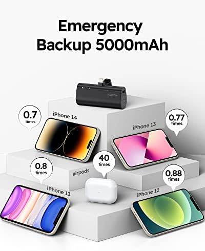 Design for All iPhones and AirPods: Portable iPhone charger is widely compatible with iPhone 13, iPhone 13 Pro, iPhone 13 Pro Max, iPhone 13 Mini, iPhone 12, iPhone 12 Pro, iPhone 12 Pro Max, iPhone 12 Mini, iPhone 11, iPhone 11 Pro, iPhone 11 Pro Max, iPhone XR, iPhone 8, iPhone 8 Plus, iPhone X, iPhone 7, iPhone 7 Plus, iPhone XS Max, iPhone XS, iPhone Se, iPhone 6s, and also other iPhones, AirPods and AirPods Pro etc. Quick Charge Recharging And Charging: Small portable charger for iphone, its USB C input supports QC 2. 0/ 3.0, FCP, AFC etc fast charging protocol (5V-2.0A, 9V-2.0A). Fully recharged only taking 1.5 hours by 9V-2A Quick recharging. Its output supports 20W PD, thus it can quick charge iPhone 8 and above iPhones series, will charge other iPhones at 5V normal charging speed. Cordless Portable Charger, Plug in and Power on for iPhone: If you are iPhones fans and are tired of carrying cables, this mini cordless portable charger is definitely best choice for you. Ultra small and ultra lightweight, dimensions is only 77.2*35.0*24.7mm (3.03''x1.38''x0.97''), only weigh 0.2lb, and no need cables again. Practical Pass-Through Features: Battery Pack supports pass through charging, when recharging power bank, it can charge your iPhones too by press the power button once. Portable phone charger supports Trickle-Charging mode, providing optimized charging for AirPods and AirPods Pro etc. Please refer to the manual to activate this Trickle-Charging mode. 5000mAh Portable Phone Chargers iPhone Battery Backup Charger: Power Bank is true 5000mAh (3.7V Battery), best emergecy portable charging source for iPhone or AirPod, normally charging around 0.8~1.5 charge for your iPhone.