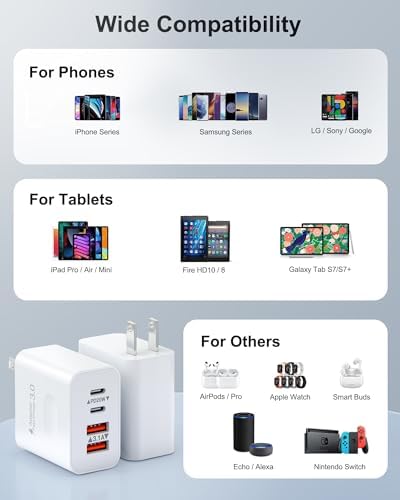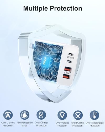 【2-Pack 40W Fast Charging Block】: The usb c charger supports the Power Delivery 3.0 and Quick Charge fast charging functions with a total power of up to 40W. The USB-C port supports a maximum power output of 20W. Charge your iPhone devices from 0% to 60% in just 30 minutes. 【USB C Wall Charger Multiport】: Upgraded USB C Charger Block has Dual USB-C ports and Dual USB-A ports. Allow users to charge 4 devices simultaneously to minimize waiting time. It’s also a great space saver instead of taking up 4 wall outlet ports. Say goodbye to your original usb charger. 【Universal Compatibility】: This usb c charging block is compatible with almost all electronic devices, charging adapter for iPhone 15/15 Pro/15 Plus/15 Pro Max/14/14 Pro/14 Pro Max/14 Plus/13/13 Pro/13 Pro Max/13 Mini/12/12 Pro/12 Pro Max/12 Mini/11/11 Pro/11 Pro Max/XS/XS Max/XR/X/8/8 Plus/7/7 Plus/6/6S/SE 2020, iPad Pro/Air/Mini, Apple Watch Series, Samsung Galaxy S23/S22/S21/S20/S10/S9/S7/A12/A13/A22/A32/A52/A53/Note 20 10/Z Fold 3, LG, Google Pixel, Kindle, Tablets, Switch and more. 【Safe and Reliable USB C Plug】: The c type charger block built-in safeguards protect your devices against short circuit, over-current, over-voltage, over-heating and over-charging. The usbc block will automatically stop charging when power is full to protect your device. 【Compact & Portable Design】: Incredibly compact size for enhanced portability. All this power comes installed in a pocket-friendly compact body, to go wherever the journey takes you. Ideal for home, office and on the go. 2-PACK DESIGN: One for travel and one at home, handling multiple devices conveniently. ★★★★★【What You Get】: We provide this 2Pack 40W 4-Port USB C Wall Charger - White (cable not included) with 18 Months Worry-free Replacement and 24/7 Online Customer Service. If you have any problems, please contact us freely and we are always at your disposal.