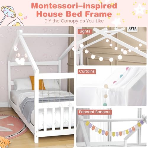 Fun & Playful Design: The charming house-shaped bed frame will inspire your child’s imagination and make bedtime more enjoyable. You can decorate the roof with pennant banners or other ornaments, making it the focal point of any kid’s bedroom. Safe Floor Bed: The twin bed for kids features a low-bed design, ensuring a safe and secure sleeping environment. You can have peace of mind knowing that your child can easily get in and out of bed without the risk of falling. Built with Solid Wood: The floor bed for kids is built with high-quality solid wood to ensure durability and stability. Plus, the sturdy plywood slats form a ventilated and supportive surface for mattress, no box spring required! Spark Their Creativity: The platform bed offers not only a comfortable place to sleep but also a world of imagination. Your child will love playing, reading, and dreaming in their own little house, making bedtime an adventure every night. Easy Assembly & Maintenance: With straightforward assembly instructions, you can quickly set up this twin house bed without any hassle. Its low maintenance design allows for easy cleaning and upkeep, making it convenient for busy parents.