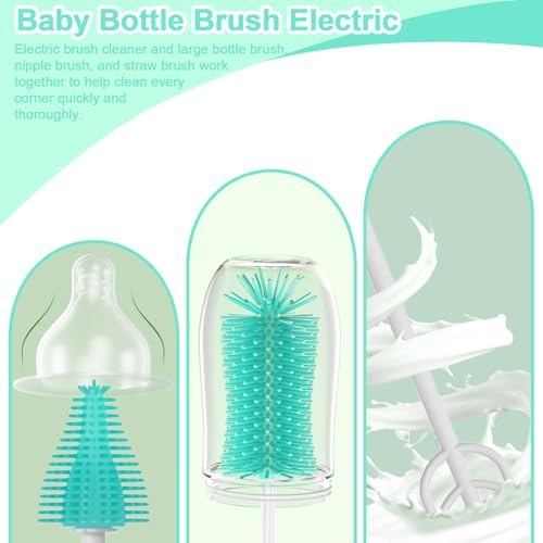 [6-in-1 Electric Bottle Cleaner Kit]--Includes electric bottle brush cleaner,water bottle brush, nipple brush, straw cleaner brush, milk frother,Travel organizer with drying base,perfect baby bottle cleaning kit for newborn parents. [Reusable Electric Baby Bottle Brush]-Two-speed mode is paired with a 1200mAh large-capacity battery and the replaceable brush heads made it can be reused again and again for a longer life. [Electric Milk Frother]--The electric milk frother accelerates the dissolution of your baby's milk powder or creates a deliciously rich, creamy foam in seconds to give your latte, cappuccino, macchiato or hot chocolate a professional finishing touch that you can enjoy at home. [Baby Shower Gift]:Automatic baby bottle brushes and electric milk frother can help new mothers save time and energy, and are completely essential for newborns.