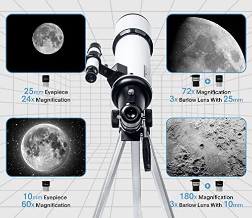 Excellent Quality Optics: This telescope is 600mm(f/6.7) focal length and 80mm aperture, 80mm aperture to capture more light picture and multi-fully high transmission coated all-optical lens enhance image brightness and clarity 6.. Optimum Magnification: Our telescope for kids and adults is quipped with two replaceable excellent-quality eyepieces (25mm and 10mm) for 24X and 60X magnification. 3x Barlow lens trebles the magnifying power of each eyepiece. magnificate moon up to 72 or 180 times. Also with 5x24 finder scope makes locating objects easy. Portable And Convenient: Comes with a phone adapter and an adjustable aluminum tripod. Wireless remote control and carrying bag make it easier for you portable and capture amazing images. Easy To Set Up: In order to save your time. Even for novices, no tools are required to set up the telescope. quick and easy to focus. Truly realize a no-tool-set telescope. Satisfaction Quality: lifetime maintenance. If you have any questions about the product and service, please feel free to contact us, we will do our best to help you in 24 hours!