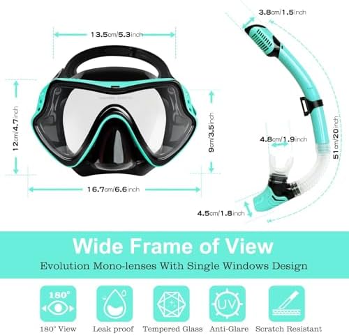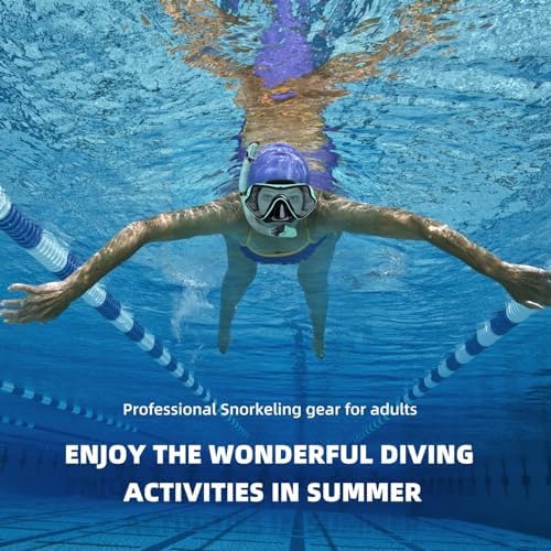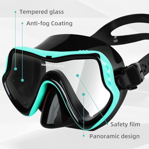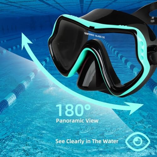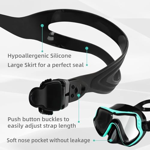 ?【SOFT SILICONE RUBBER】: Leak proof, comfort seal skirt and strap adopt soft silicone, which molds to the shape of your face for comfortable fit and watertight seal. No more leak or discomfort. seals on face well without worrying about water leakage when scuba diving snorkeling or swimming. ?【TEMPERED GLASS LENS】: Swim mask chooses the ultra clear thickened tempered glass with a safety film to withstand deep water pressure for all types of diving or swimming. Scratching resist lens provides the clearer view under water. ?【180°PANORAMIC VIEW & ANTI-FOG】: Advanced lens shape design and thickened tempered glass with latest anti-fog treatment means you'll have a crystal clear underwater experience without blurring or distortion. One piece glass design enables better and wider vision under water. ?【SOFT NOSE COVER】: Swimming goggles is with soft silicone nose cover, which is needed to compensate for increasing pressure as swimming, snorkeling or diving. Also it's helpful for who do not know how to stop breathing by nose underwater. Perfect for snorkeling and recreational swimming. ?【PRACTICAL GIFTS AND QUALITY AFTER-SALES SERVICE】: You will get Swim Mask , Nose Clips and Ear Plugs, and Mesh Pouch come with a 100% satisfaction guarantee, a 30-day trial period and 24-hour online after-sales service to solve any problems for you .